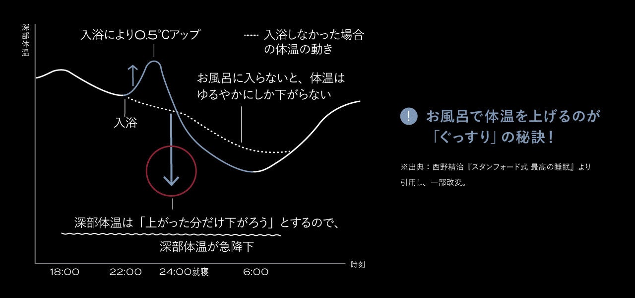 「黄金の90分」を実現するには深部体温の低下がポイントです。ヒトの体は、恒常性(ホメオスタシス)により、大幅な体温変化が起こらないようになっていますが、入浴は変動に大きく寄与します。入浴により深部体温は一時的に急上昇し、その上昇分だけ大きく低下しようとする性質から、入浴は効果的に深部体温を下げることができます。