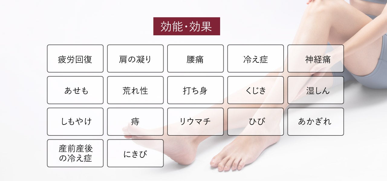 有効成分が温浴効果を高め血行を促進し、新陳代謝を活性化することにより、17の諸症状に効果があります。