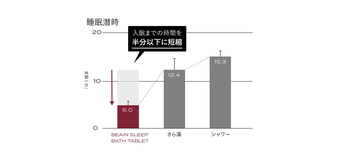 「ブレインスリープ バスタブレット」を使用した入浴では、ベッドに入ってから眠りにつくまでの時間(睡眠潜時)がさら湯*の入浴と比較して平均6.4分短縮しました。
