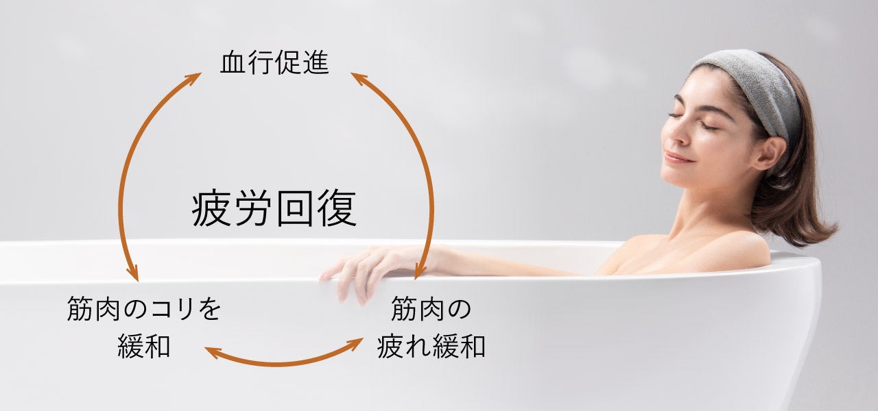 疲労回復力を高めるため必要な成分を厳選し、4種類の有効成分を凝縮。入浴後徐々に血流量が増えて体温の上昇を促すことで、忙しい日も時短入浴で体の芯から温めます。