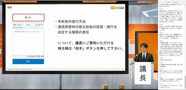 <株主総会の様子:画面右側に自動文字起こしの表示>