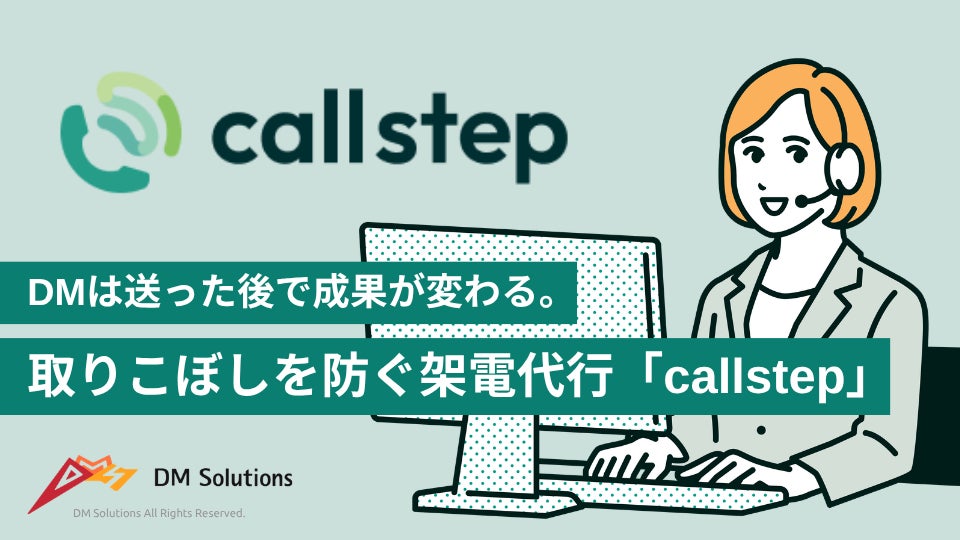 ディーエムソリューションズ株式会社 (本社:東京都武蔵野市 、代表取締役:花矢卓司 )は、成果につなげるために設計された架電代行サービス「callstep(コールステップ)」 の提供を開始いたしました。 創業から20年以上、DM(ダイレクトメール)の発送代行を通じて多くのお客様を支援してきた中で、「発送後のフォローまで手が回らず、せっかくの反響を逃している」という課題を数多くいただいてまいりました 。こうした顧客の声に応えるべく、当社のインサイドセールス領域で培ったノウハウ を結集し、次のアクションにつながる高品質な架電を実現します 。