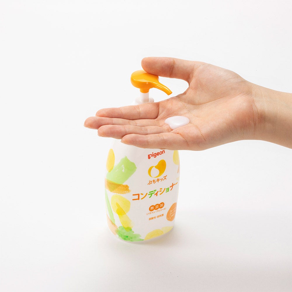 植物性コンディショニング成分配合コンディショナーは、子どもの未熟な頭皮・毛髪を労りながらヘアケアが可能です。乳液のような伸びのいいテクスチャーで、繊細な子どもの髪にすっとなじみ浸透。さらにさっと洗い流せます。ドライヤーでも乾かしやすく、七五三などに向けて伸ばしている長い髪のブラッシングも絡まりにくくスルンとまとまります。