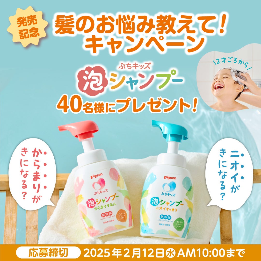 ピジョン株式会社(本社:東京、社長:北澤 憲政)は、赤ちゃんから子どもへと成長し、活動量が増えた子どもの頭皮と髪の汚れをしっかり落としやさしくケアする、2才頃から使用可能なヘアケア用品「ぷちキッズ 泡シャンプー ニオイすっきり」「ぷちキッズ 泡シャンプー からまりするん」、および「ぷちキッズ コンディショナー」を、2025年2月10日(月)より全国のベビー用品専門店・ドラッグストア、当社公式オンラインショップにて販売します。また、発売を記念し、抽選で40名様に本商品が当たるモニターキャンペーンを開催いたします。