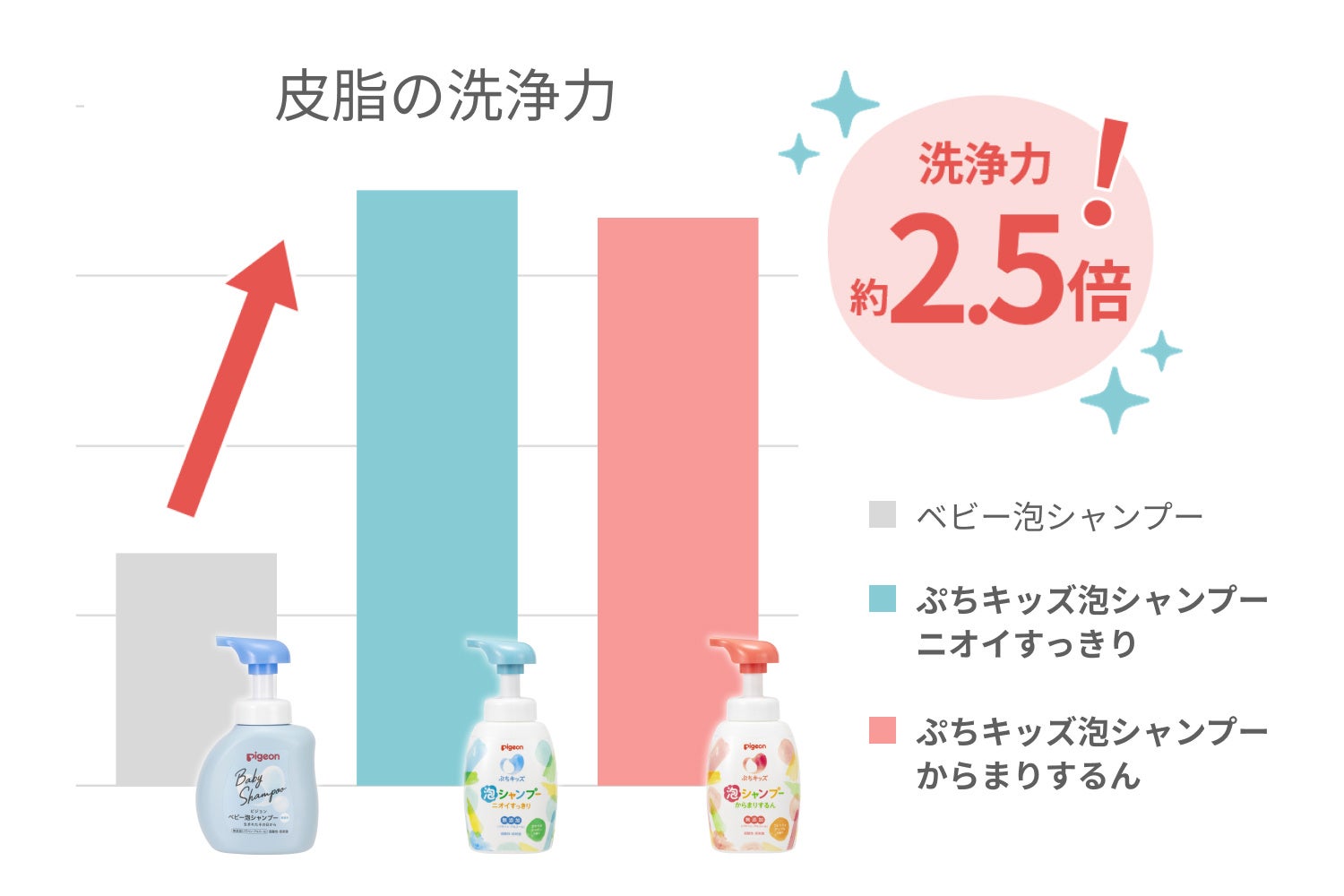 ベビー用シャンプーと比べて約2.5倍の洗浄力がある(※6)「ぷちキッズ 泡シャンプー」は、汗や皮脂の洗浄に特化しています。さらに、子どもの頭の気になるニオイをケア(※7)できるよう設計しました。