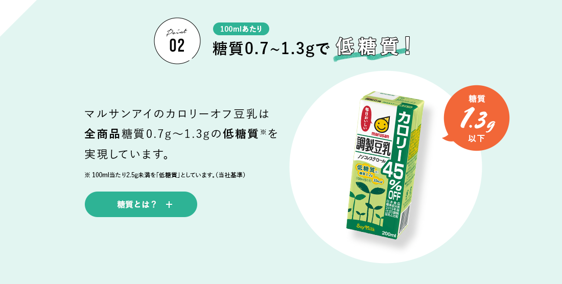 当社のカロリーオフシリーズはすべて低糖質※の調製豆乳および豆乳飲料です。製品100ml中糖質0.7~1.3gの低糖質を実現しています。