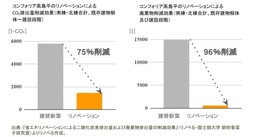 建物のリノベーションは、新築と比較して投入資材量や施工時の燃料を大幅に削減することができ、CO2排出量の削減に貢献する取組みであり、また、建物の解体により排出される廃棄物も大幅に削減することができます。しかしながら、建物のリノベーションは個別性が高く、これまでに調査された事例も多くありません。そこでこれまで、リノベるは、金沢工業大学 佐藤考一研究室と国士舘大学 朝吹香菜子研究室と共に、CO2削減効果と廃棄物削減効果の算出・見える化すべく、産学共同研究を実施してまいりました。そして、今回、東急不動産とリノベる、国士舘大学 朝吹香菜子研究室は、リノベーションに加え、省エネリノベーションによるCO2削減効果と廃棄物削減効果を算出・見える化すべく、産学共同研究を実施いたしました。