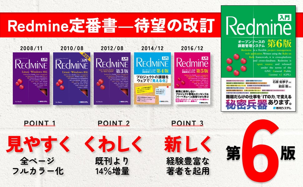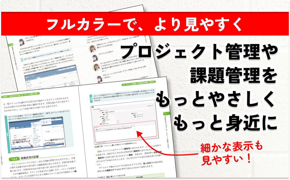 第6版は、全ページフルカラーでお届けします。細かい文字が並ぶ設定画面が、より「見やすくなりました。課題管理やプロジェクト管理がもっとやさしく、もっと身近に感じられるはずです。
