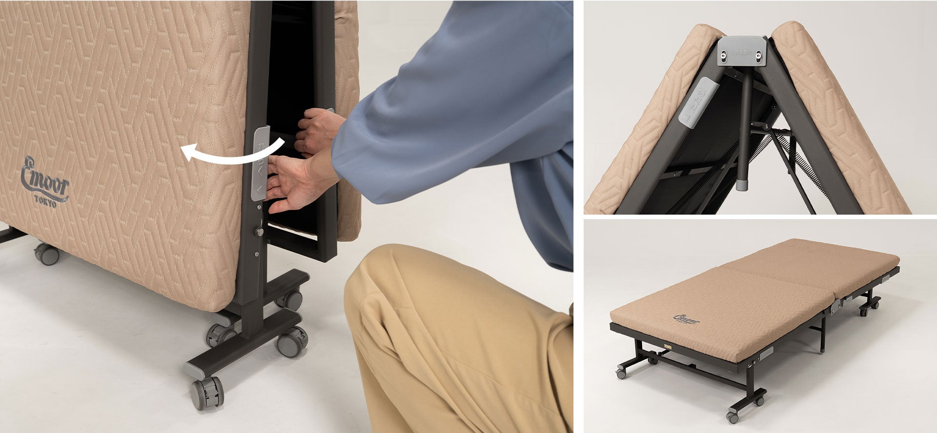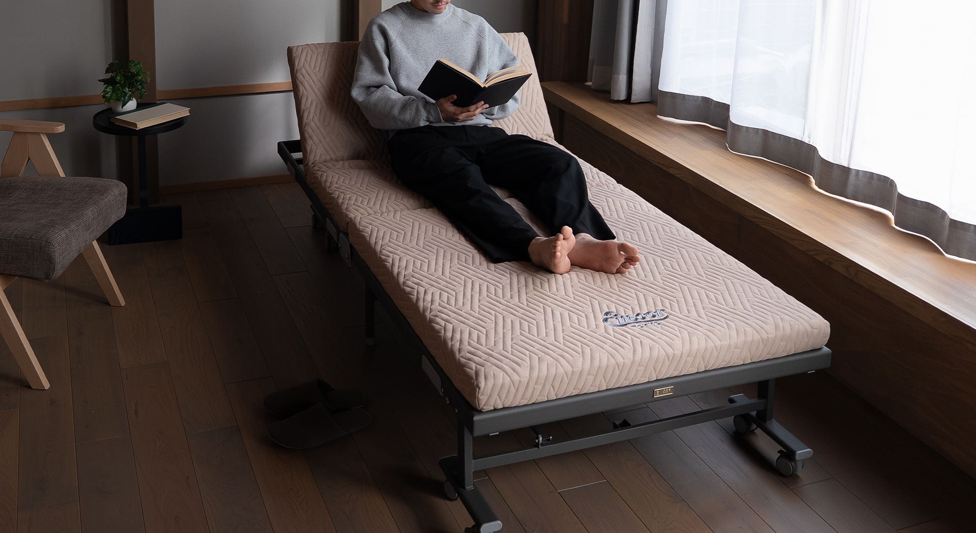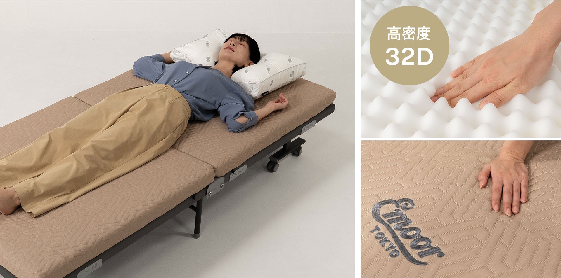 折りたためる可動式でありながら、寝心地は固定ベッド級の安心感。エムールが日本睡眠学会、日本睡眠環境学会で発表している寝心地研究に基づき、幅広い年代・体型に合うマットレスを搭載しています。体圧を分散する高反発プロファイルウレタンが、身体をしっかり支え、快適で本格的な寝心地を実現します。夜は快適に眠れるベッド、日中は空間を広く使える、1台で“眠り”と“省スペース”を両立するパートナーです。