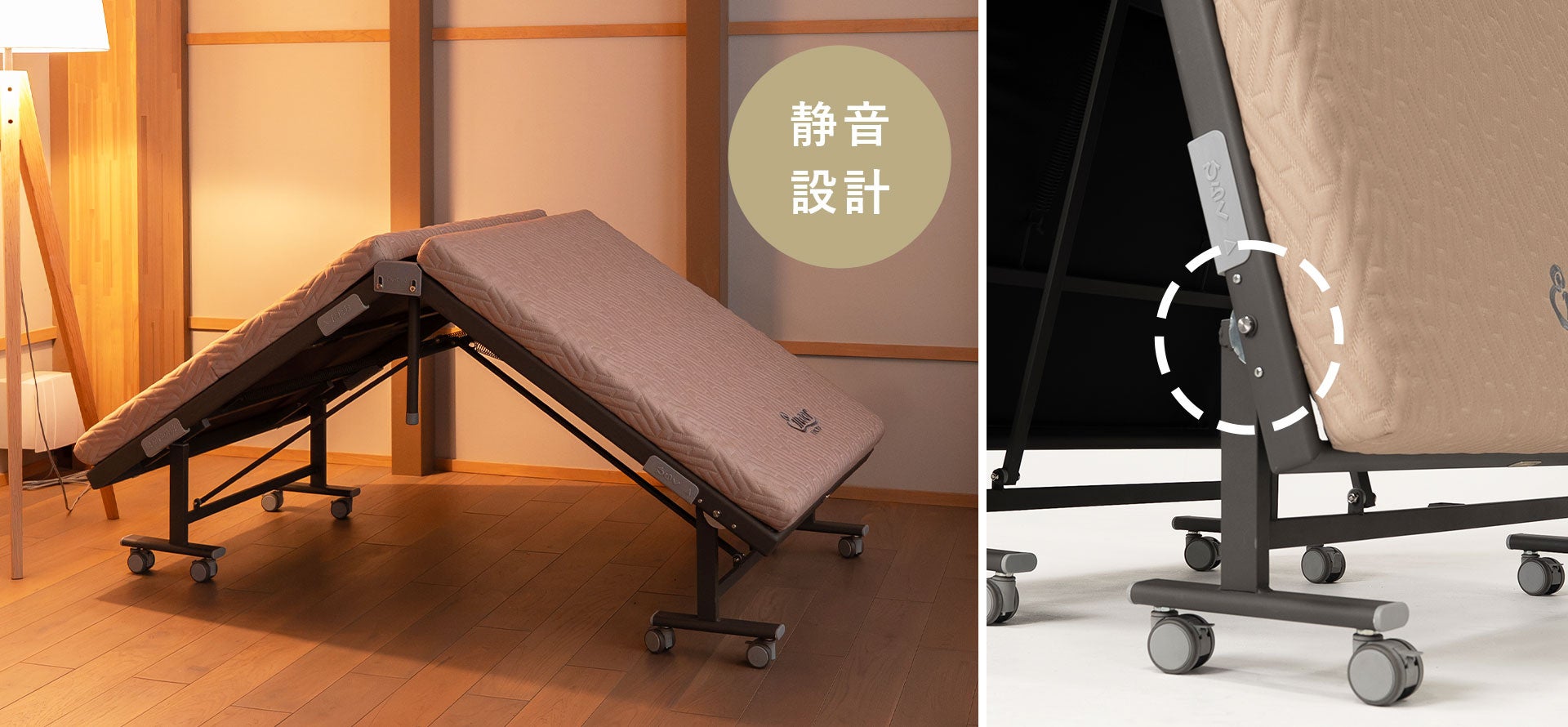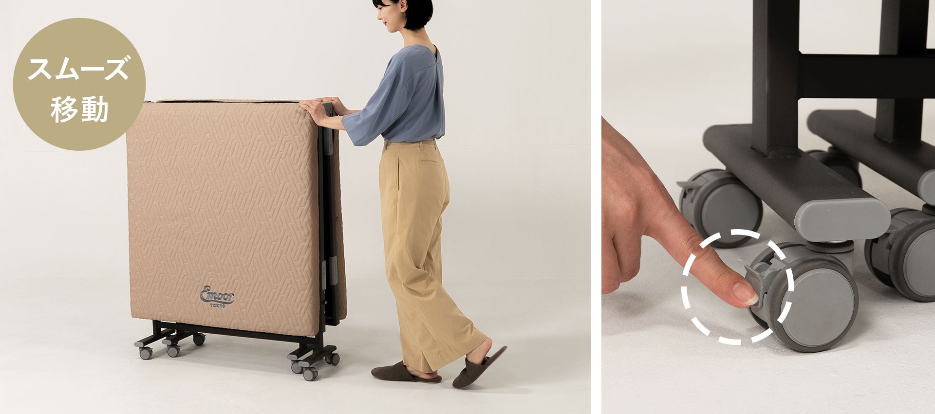 高品質ベアリングキャスターが、静かで滑らかな走行性を実現。わずかな力でスッと動くため、移動も開閉もスムーズです。折りたたみ時の負担が少なく、こまめな掃除や模様替えもしやすいので、いつでも快適な空間を保てます。就寝時はキャスターロックで安定した眠りを提供します。
