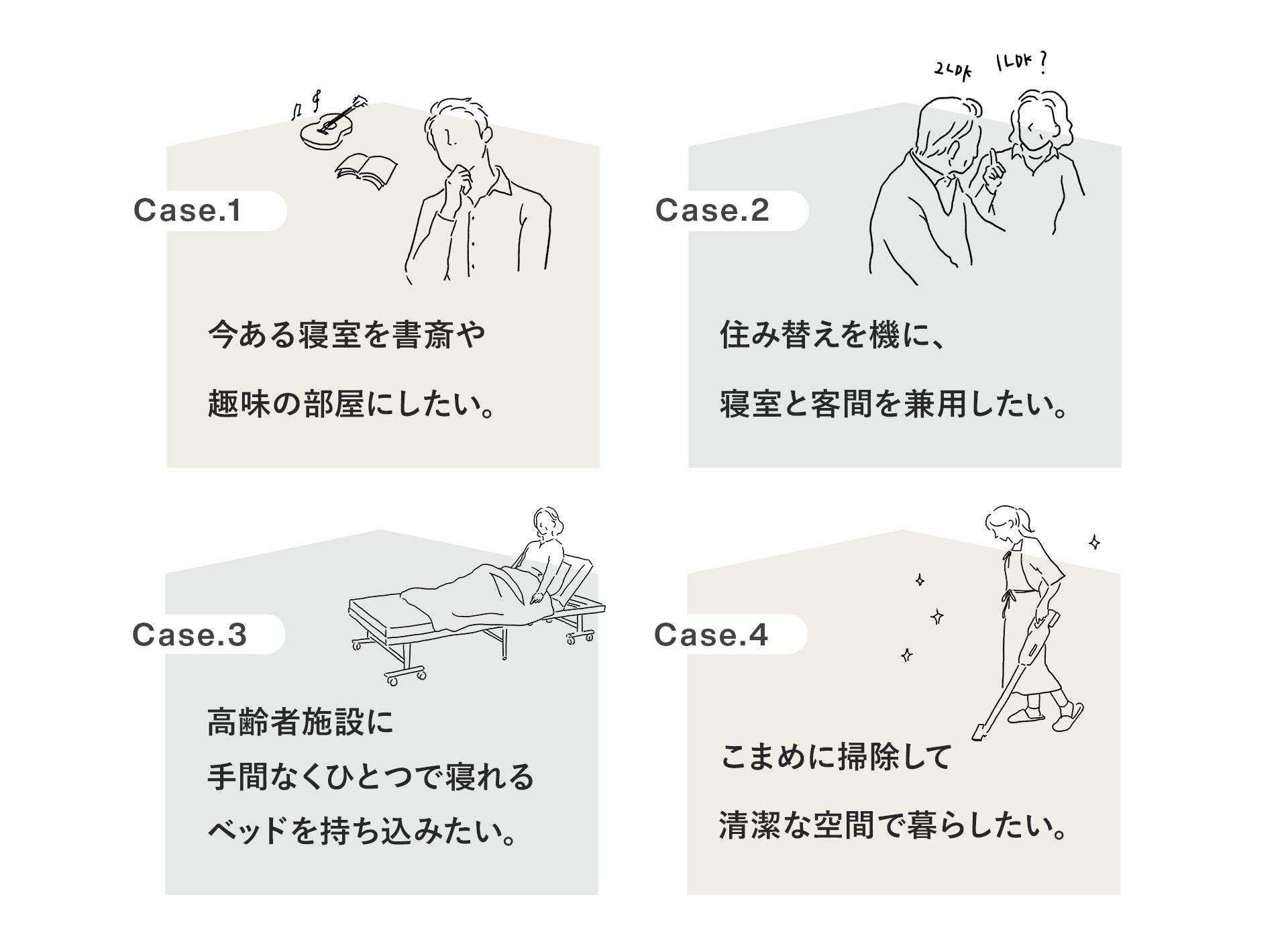 70~90代:高齢者施設への入居時に、ストレスなく快適に眠り、休む場所を運び入れることができます。