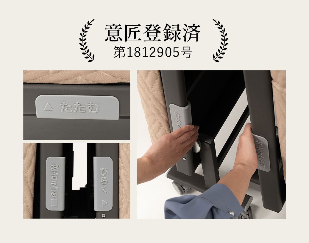 ※ラクシムは「状態の切り替え動作を容易にすることができる折りたたみベッド」として実用新案登録しています。(登録番号第3252706号)