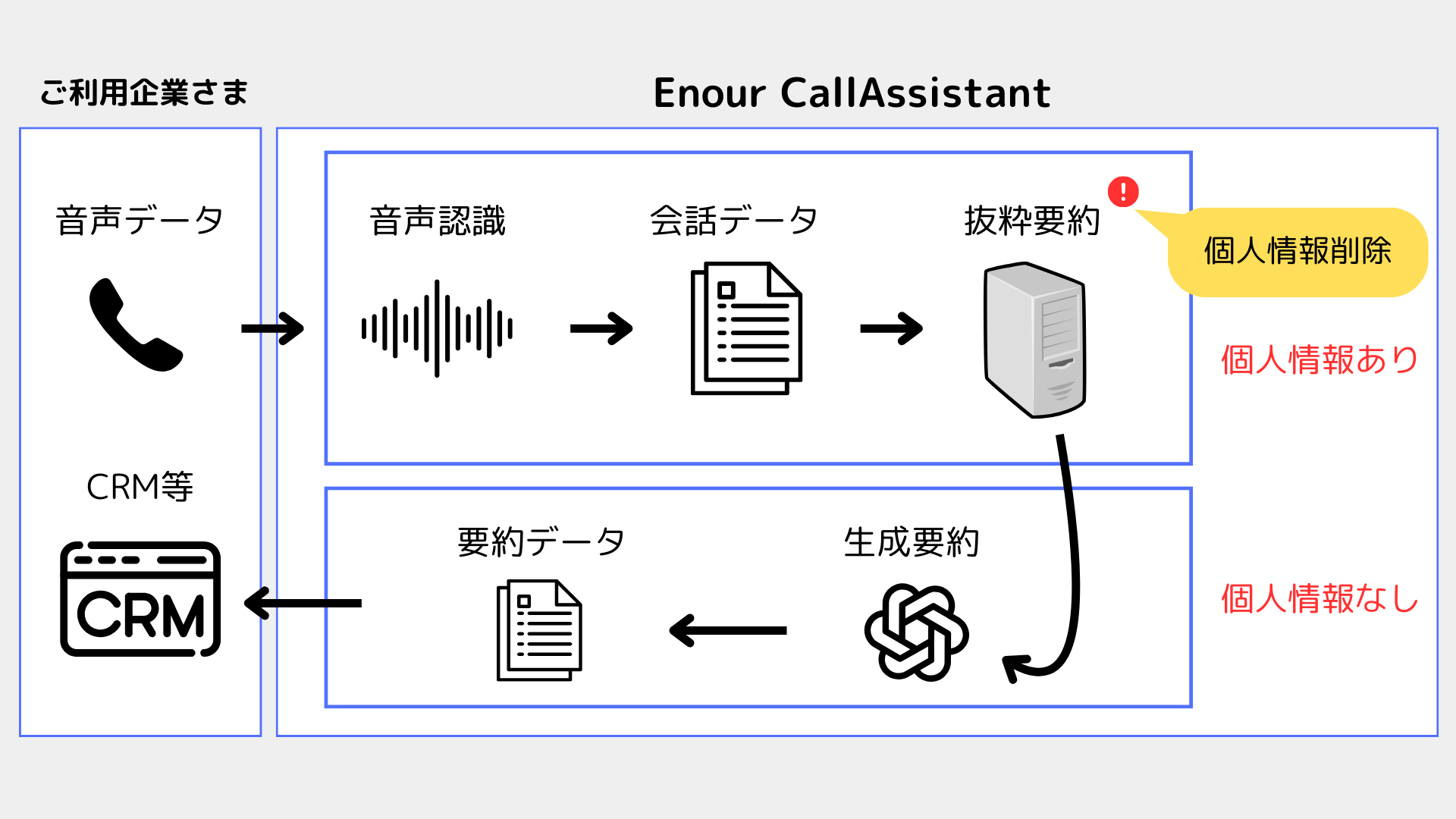 コンタクトセンターの応対内容には個人情報が多く含まれるため、生成AIへは学習させない等の対処が必要となります。本機能では、会話の重要部分を要約する「抜粋要約」の段階で個人情報の削除処理を行い、生成AIが個人情報の学習をすることを防ぐため、安心して利用いただけます。