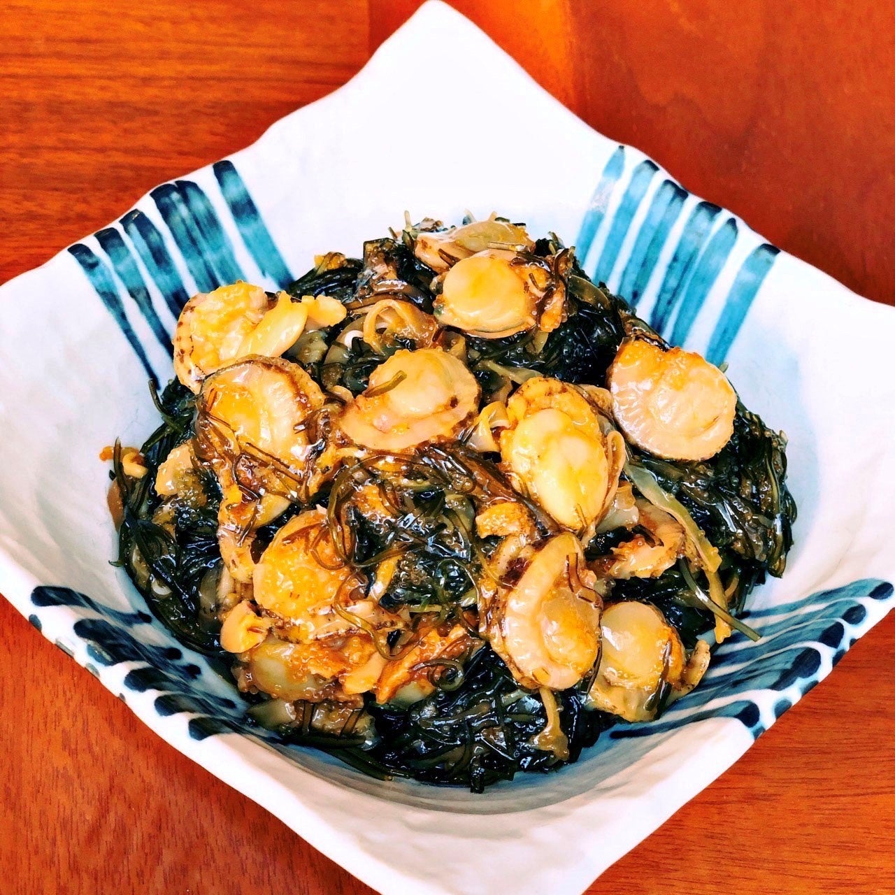 「北海道の郷土料理『松前漬け』に、炙ったホタテ加えて和えています。松前漬けの特徴であるするめの旨味と昆布の粘り、数の子のプチプチした食感に、甘くて柔らかい帆立が加わり、くせになる事間違いなし。