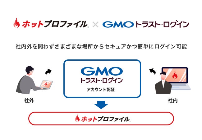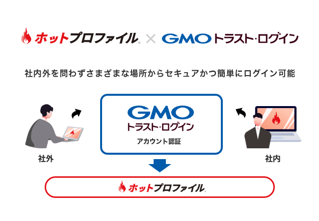 「GMOトラスト・ログイン」のアカウント認証のみで、社内外を問わずさまざまな場所からセキュアかつ簡単に「ホットプロファイル」にログインができるようになります。