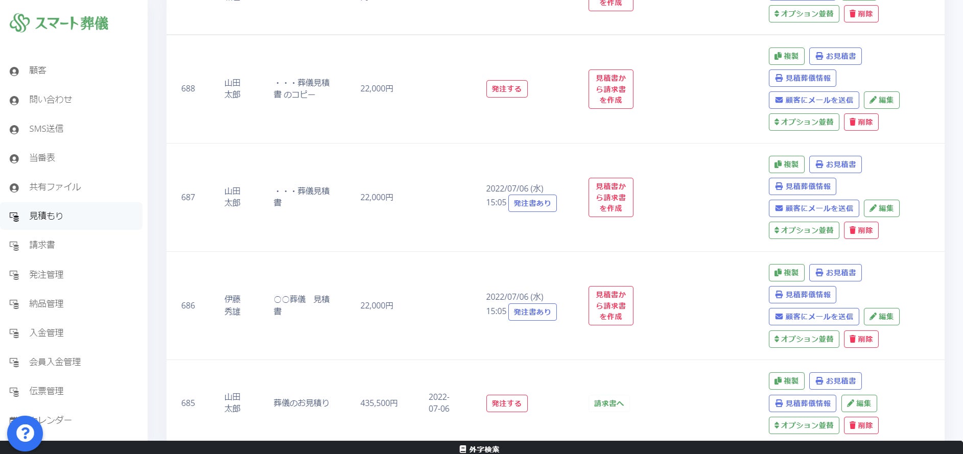 葬儀費用の見積書作成だけでなく、電話注文を受けた際にシステムに顧客登録をすればそのまま注文者への請求書の郵送処理がワンクリックで完結します。