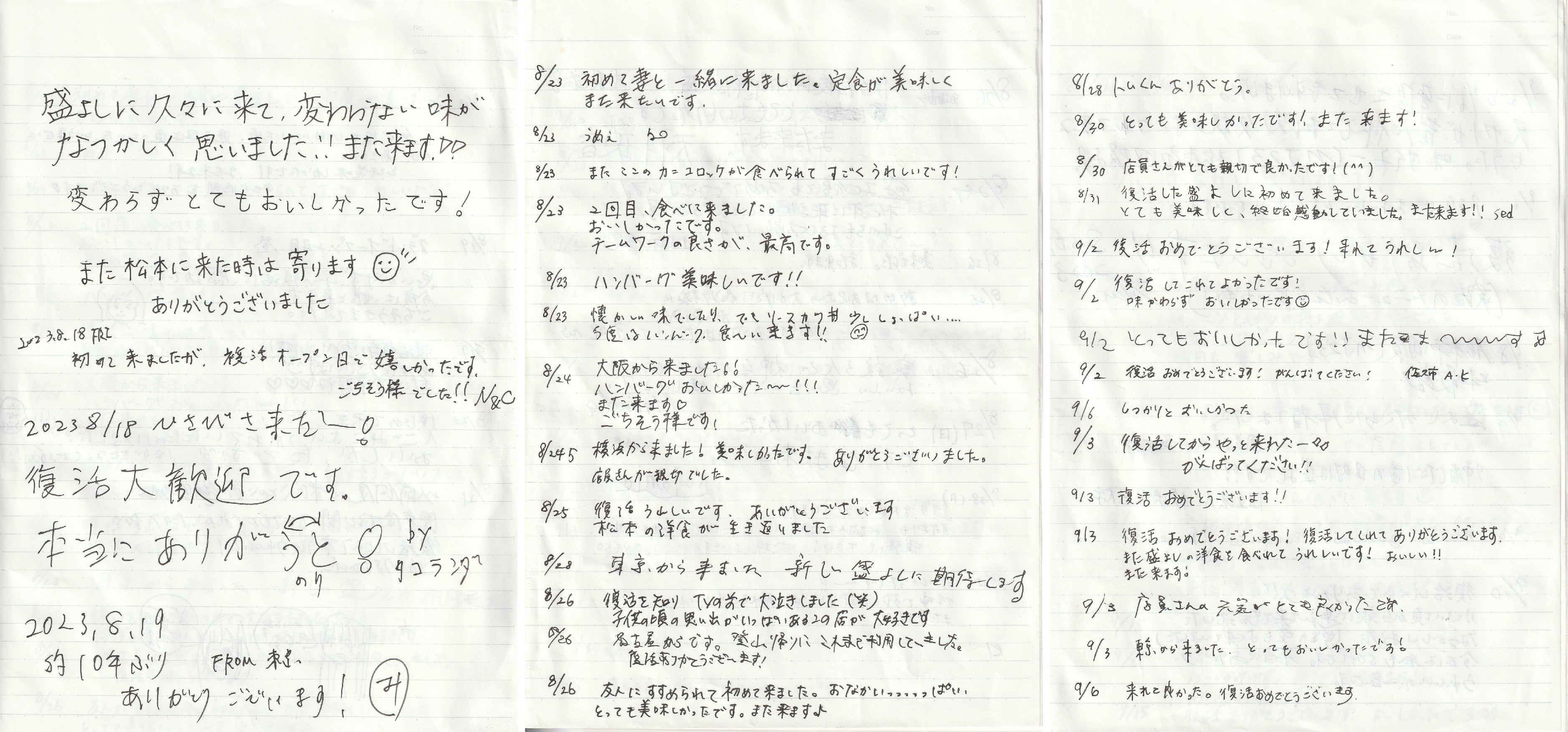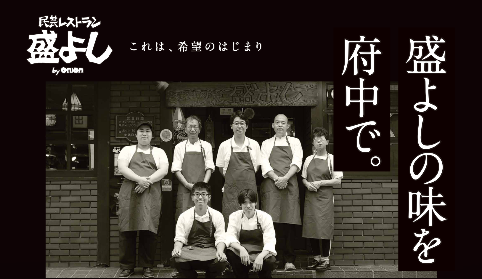 それから5ヶ月後の8月、奇跡のような出会いから「思い出の味を思い出だけにはしたくない」というスローガンの元「民芸レストラン 盛よし by onion」として復活プロジェクトが開始。盛よしの味を愛してくださっていたファンの皆様に、「変わらない盛よしの味」をお届けするため、レシピは営業当時のものを受継ぎ、当時と同じメニューを再現。盛よしで40年以上腕を振るった大ベテランのシェフと、その右腕として20年以上腕を振るったシェフ、盛よしの味を熟知した2人が、「思い出の味」を再び提供しています。