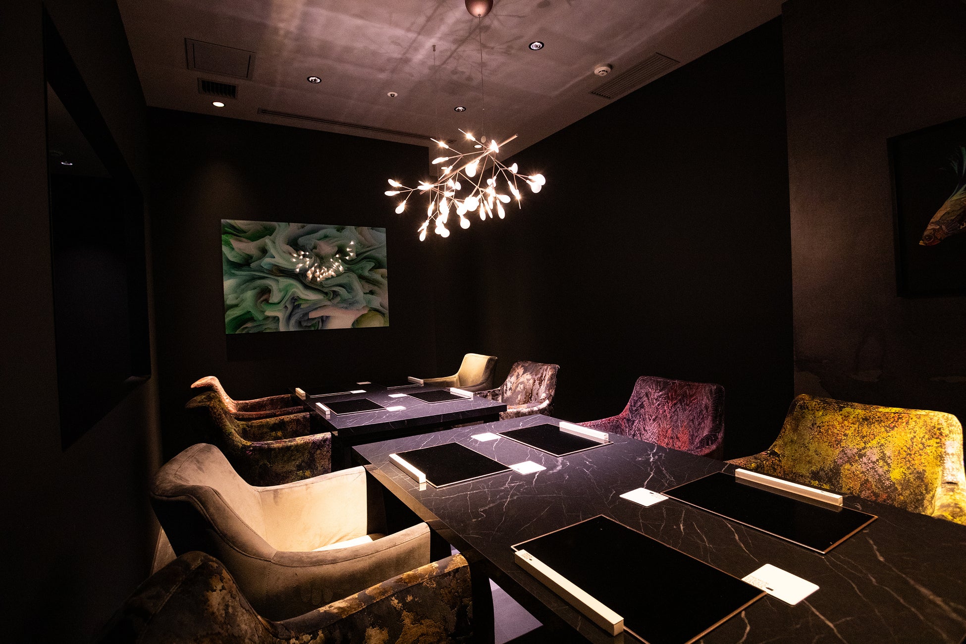落ち着いた大人の雰囲気が漂うシックな店内は、カウンター席のほかに、プライベートな雰囲気で楽しめるテーブル席もご用意。接待や、記念日などの特別なシーンでも、ご利用いただけます。