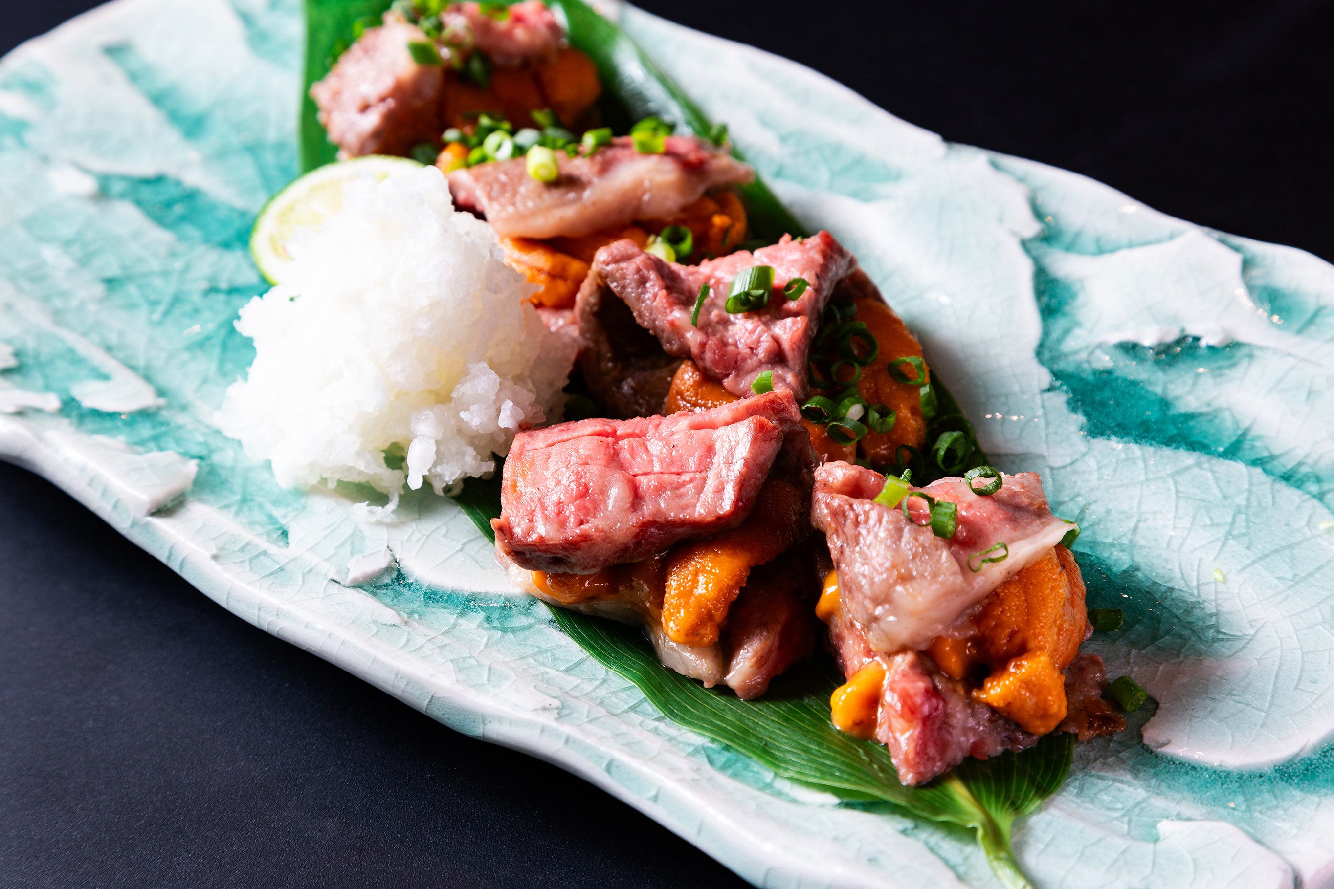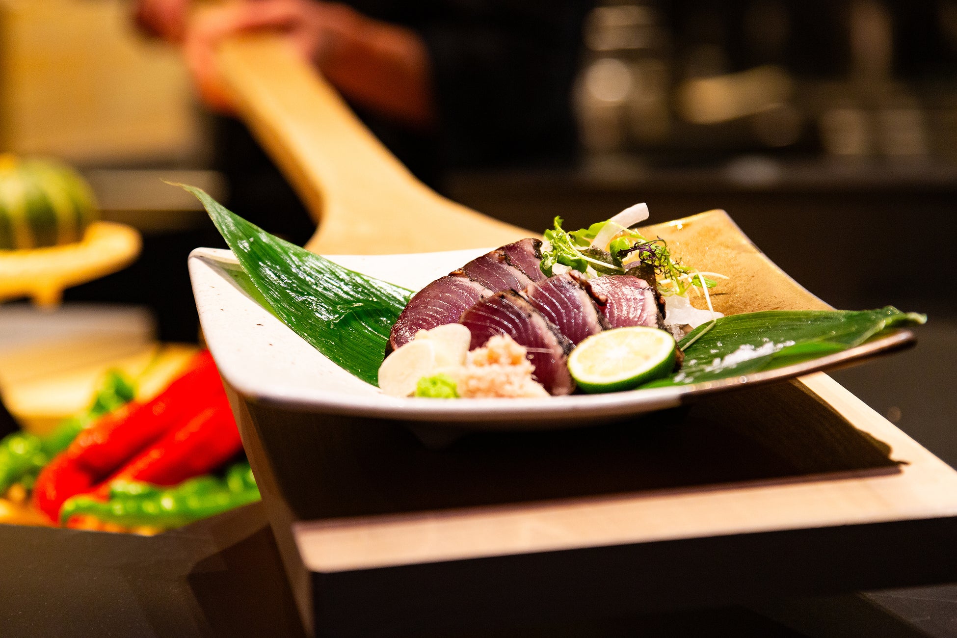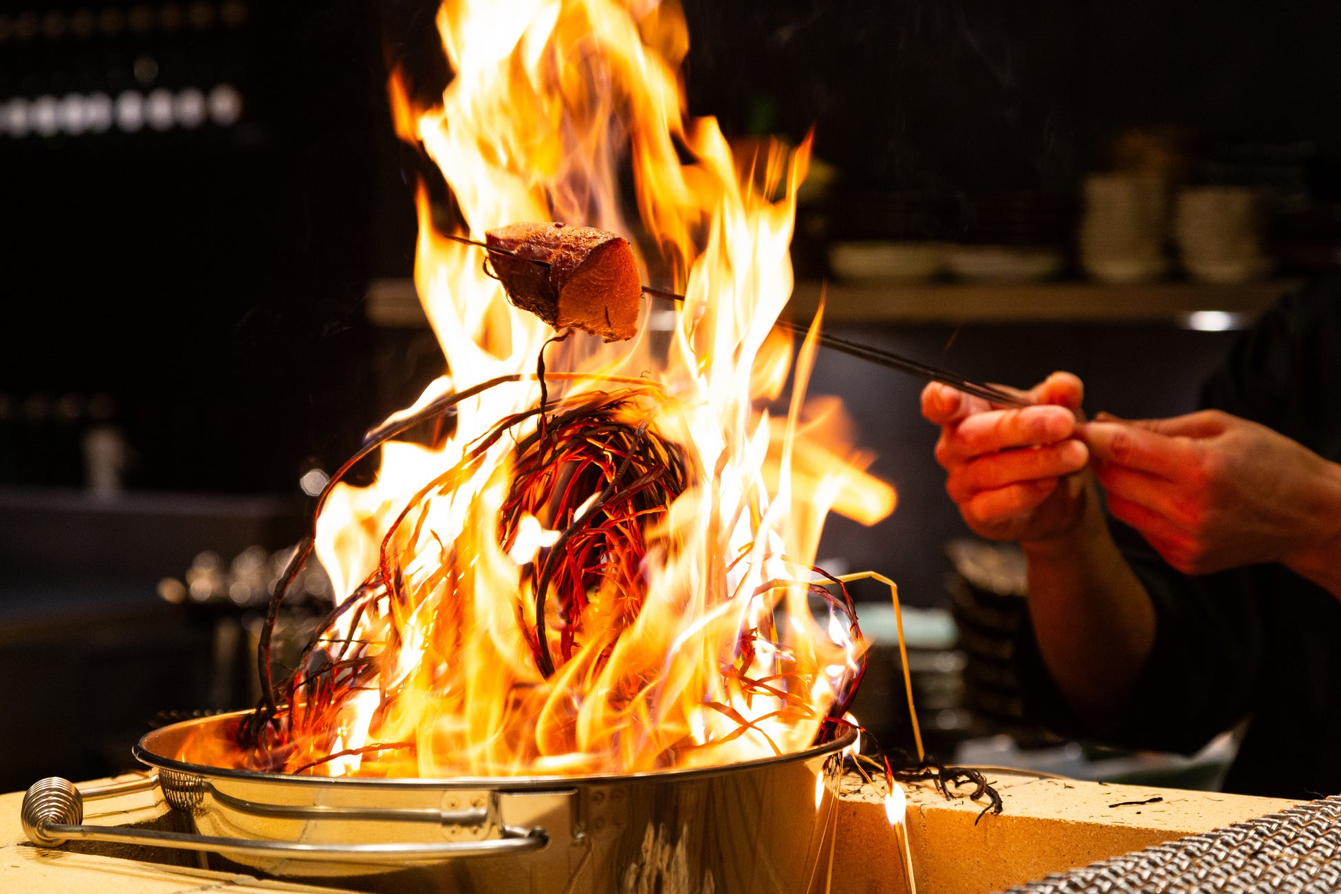 「五感で楽しむ最高の日本」をコンセプトに、職人がこだわり抜いた旬のプレミアムな食材を炉端焼きや、伝統料理の藁焼きで香ばしく焼き上げ、日本独自のスタイルでもある大きなしゃもじでお客様に提供します。目の前のオープンキッチンで焼かれる藁焼きは、ダイナミックな炎が上がりライブ感も楽しんでいただけます。