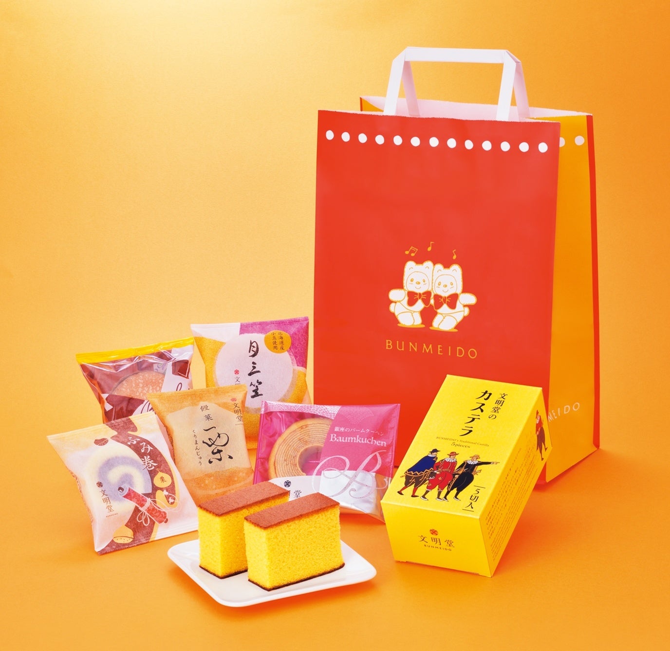「文明堂東京」の看板商品「文明堂のカステラ」をはじめ、どら焼き、バウムクーヘンなど和洋菓子6種の詰合せです。