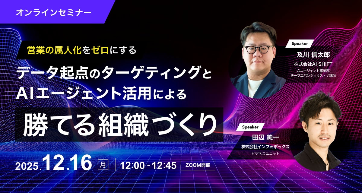 株式会社サイバーエージェント(本社:東京都渋谷区、代表取締役:藤田晋、東証プライム市場:証券コード4751)のグループ会社である株式会社AI Shift(本社:東京都渋谷区、代表取締役社長:米山結人、以下AI Shift)は、今アプローチすべき企業とその理由」がわかる、営業データプラットフォームを提供する株式会社インフォボックス(本社:東京都千代田区、代表取締役CEO:平沼 海統)と共同で、インサイドセールスとフィールドセールスの業務をデータを軸に、AIエージェントで進化させる最新オンラインセミナーを開催いたします。