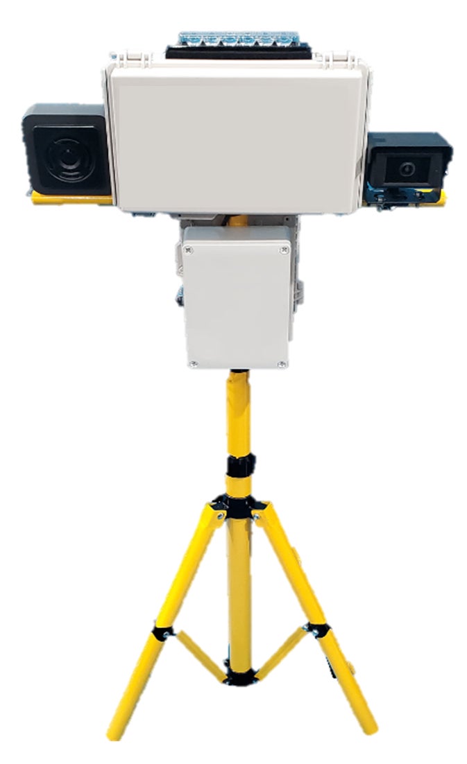 「アクティオAIボイス」は、AIカメラを使用して区画監視し、注意喚起するシステムです。建設現場などの立入禁止区域に人物を検知すると、機械上部のライトが点灯し、スピーカーから注意を促す音声が流れます。音声は4種類あり、用途に合わせてスイッチで変更が可能です。