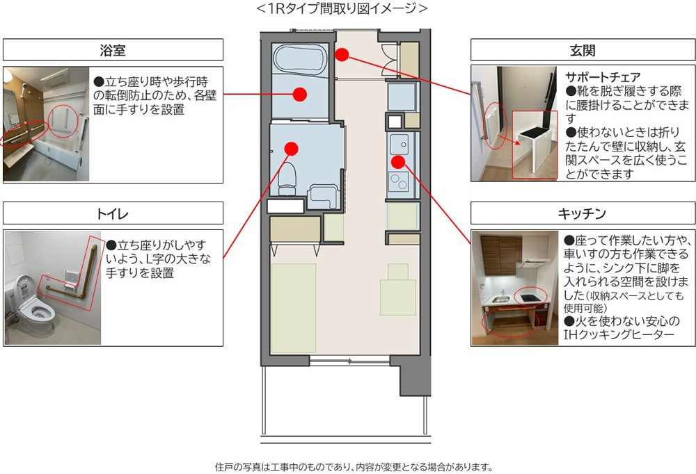 本住宅は、1Rと1DKの間取りを有する40戸の「JKKシニア住宅」を併設しています。高齢者が自立した生活を送ることができるよう、引き戸の玄関扉やIHコンロを備えた通常より高さの低いシステムキッチン等の設備を備え、バリアフリー仕様の住宅としています。また、住戸内に設置した「緊急通報装置」や「センサー」による見守りサポート(HOME ALSOKみまもりサポート)を備えており、高齢者の安心・安全な暮らしをサポートします。