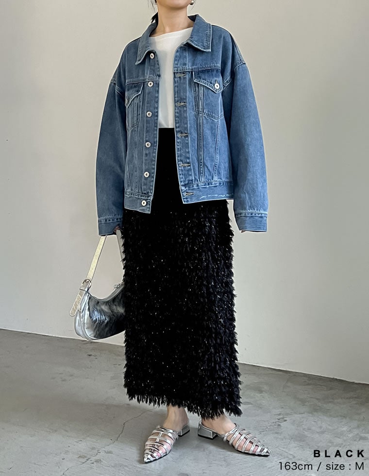 表面にラメ糸をMIXした、フェザーのような柔らかいフリンジが、今季のトレンド感を演出します。