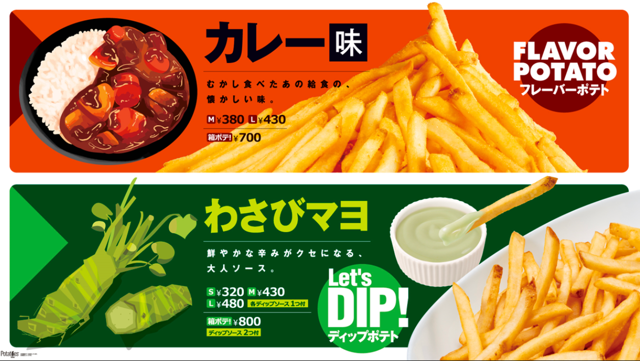 ディップポテト わさびマヨ S:320円 M:430円 L:480円 箱ポテ:800円(フレンチフライ+ディップソース)