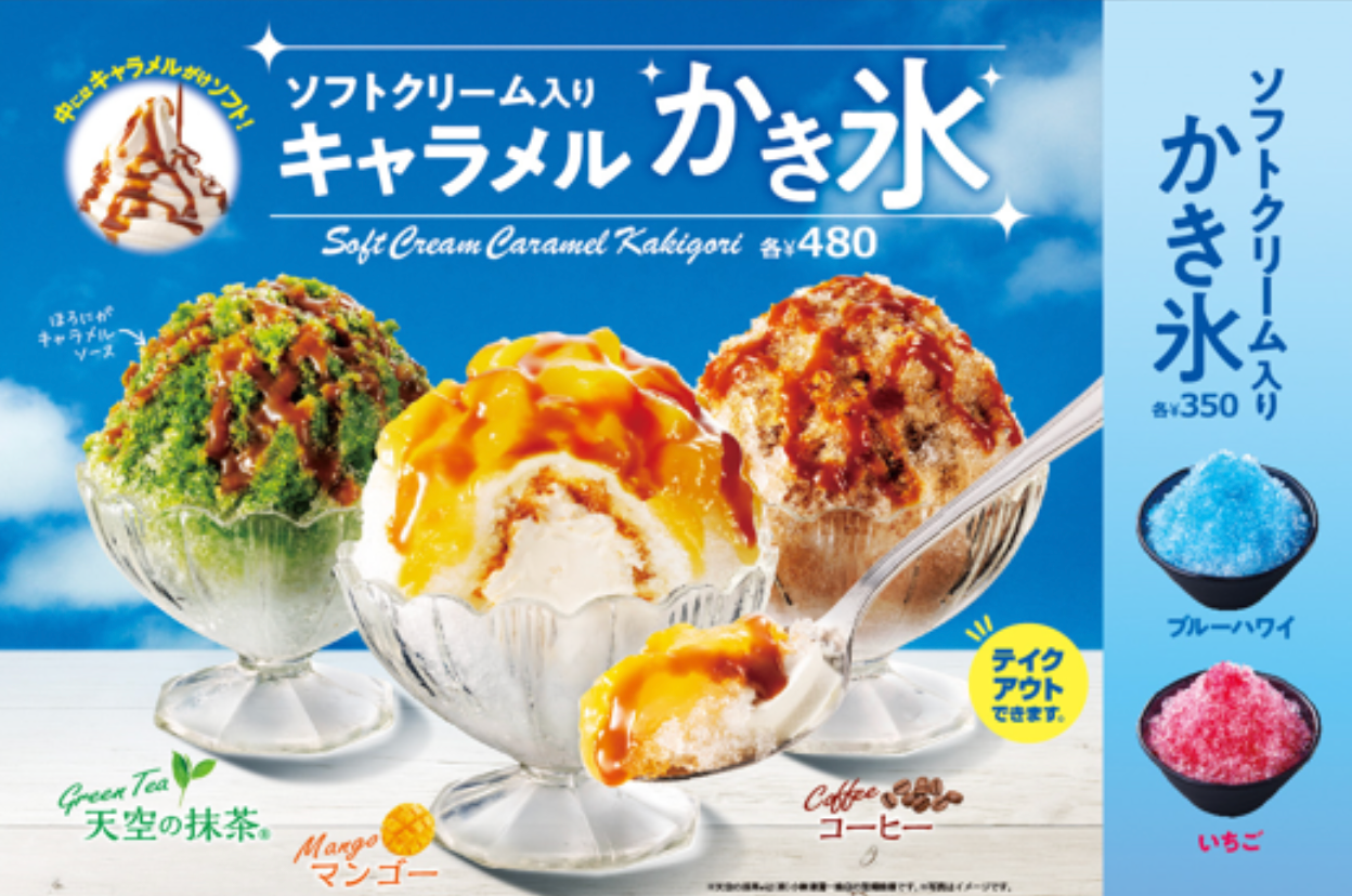 今年もすべてのかき氷にファーストキッチン自慢のソフトクリームを入れちゃいました。最後までおいしくお召し上がりいただけるよう、キャラメルソースをかき氷の上と中にたっぷりと。果肉感のあるとろ~りマンゴーソースや天空の抹茶®、コーヒーなど、人気のフレーバーと組み合わせた季節限定商品です。またラインナップには定番で親しみのあるいちごやブルーハワイもご用意しました。甘味処のようなかき氷がファストフード店で気軽に楽しめます。