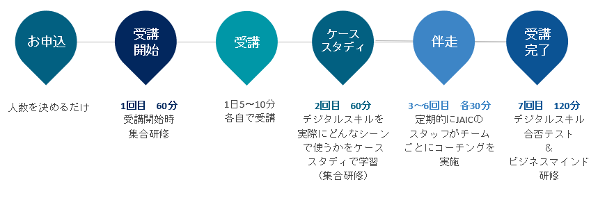 90日間で汎用的なPCスキルが網羅的に身に付く『eラーニング×伴走型』という新しいハイブリッドスタイルの人材育成プログラムです。1レッスン5~10分ほどのコンテンツであるeラーニングと、計7回の研修やチームコーチング(オンラインにて実施)を掛け合わせ、DXに必要不可欠なITスキルに加えて、Excel/Word/ PowerPointなどの業務で必須となるソフトウェア、その他にも様々なソフトウェアを実際に用いて学習していきます。