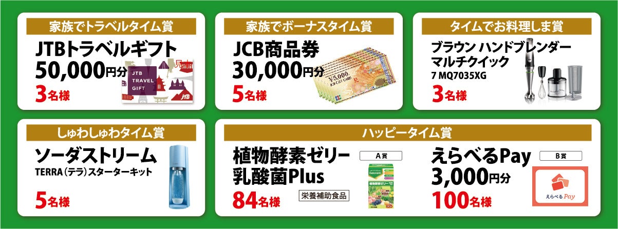 ご応募いただいた方から抽選で合計200名様にプレゼント! 【家族でトラベルタイム賞 3名様】 JTBトラベルギフト 5万円分 【家族でボーナスタイム賞 5名様】 JCB商品券 3万円分 【タイムでお料理しま賞 3名様】 ブラウン マルチクイック7 ハンドブレンダー 【しゅわしゅわタイム賞 5名様】 ソーダストリーム TERRAスターターキット ★ハッピータイム賞★ 【A賞 84名様】植物酵素ゼリー乳酸菌Plus 【B賞 100名様】えらべるPay3,000円分 |