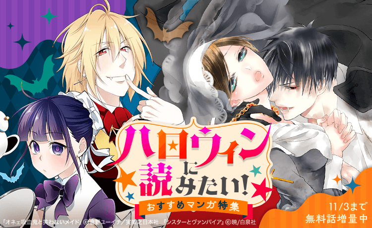 「ハロウィンに読みたい!おすすめマンガ特集」では、吸血鬼や悪魔が登場するなど、ハロウィンにぴったりのマンガを大特集します。聖女と夜の獣の妖艶なる吸血鬼ロマンス『シスターとヴァンパイア』(白泉社)や、オネェ言葉を話す吸血鬼と超絶不器用な新人メイドのドタバタコメディ『オネェ吸血鬼と笑わないメイド』(実業之日本社)などの人気作が無料話の増量でお得に読むことができます。