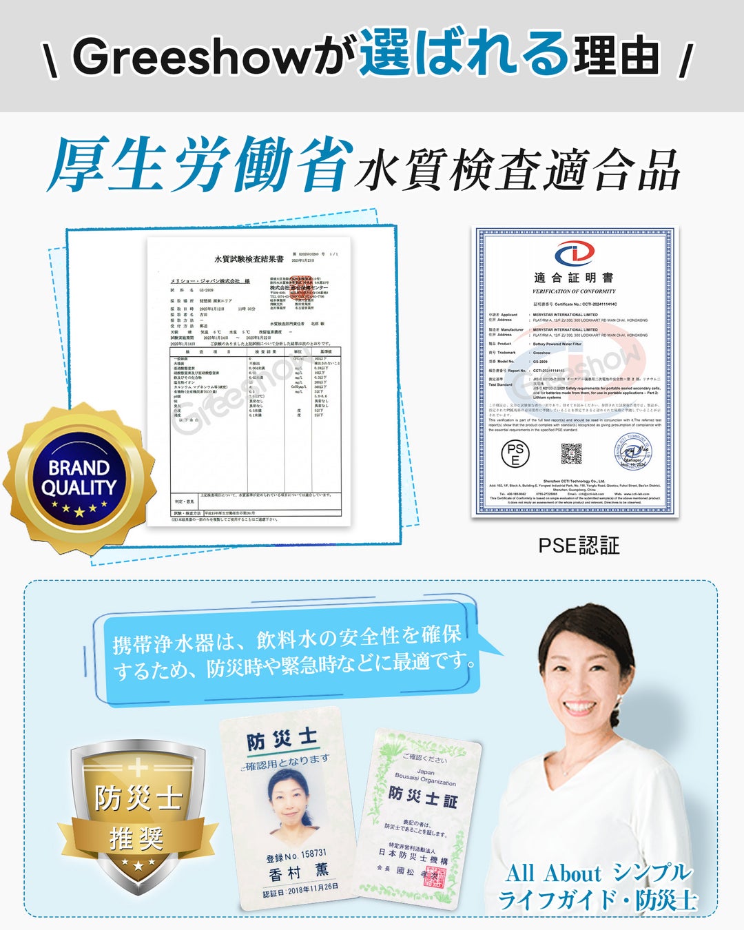 国際的なSGSによる微生物検査と日本厚生労働省の水質基準検査をクリア。プロも信頼する安全品質が証明されています。国内検査機関で99.9999%の除去率を実証し、水道水や川、雨水を清潔な飲料水に変えます。ミネラルを残しつつ雑菌を除去するのはGreeshowだけ。PSEマーク取得で安全にご使用いただけます。