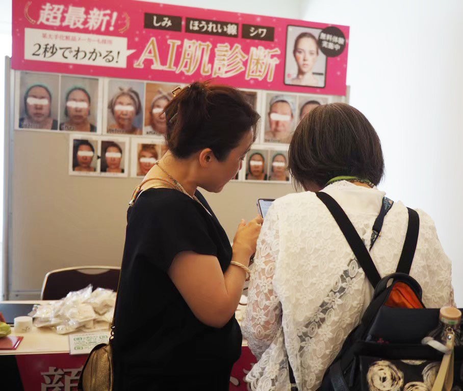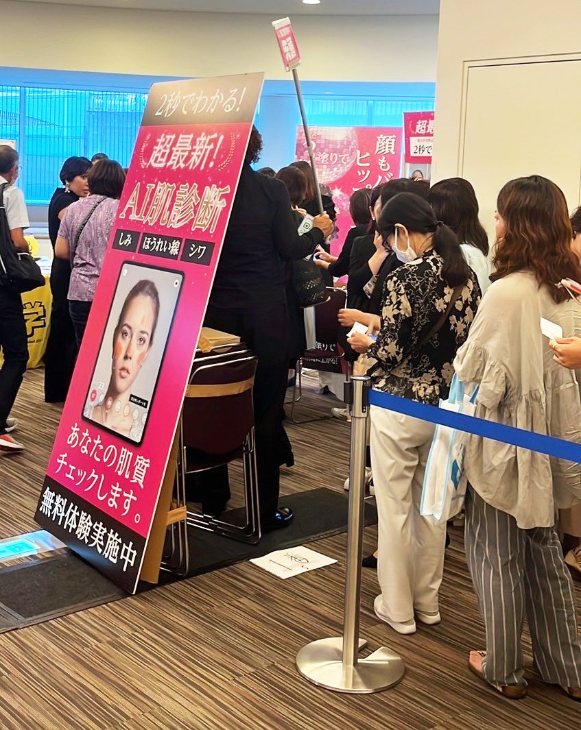 イベントブースでは「スキンケアプロ」を使用したAI肌診断が来場者の関心を集め、30分待ちの行列ができるほどの人気を博しています。