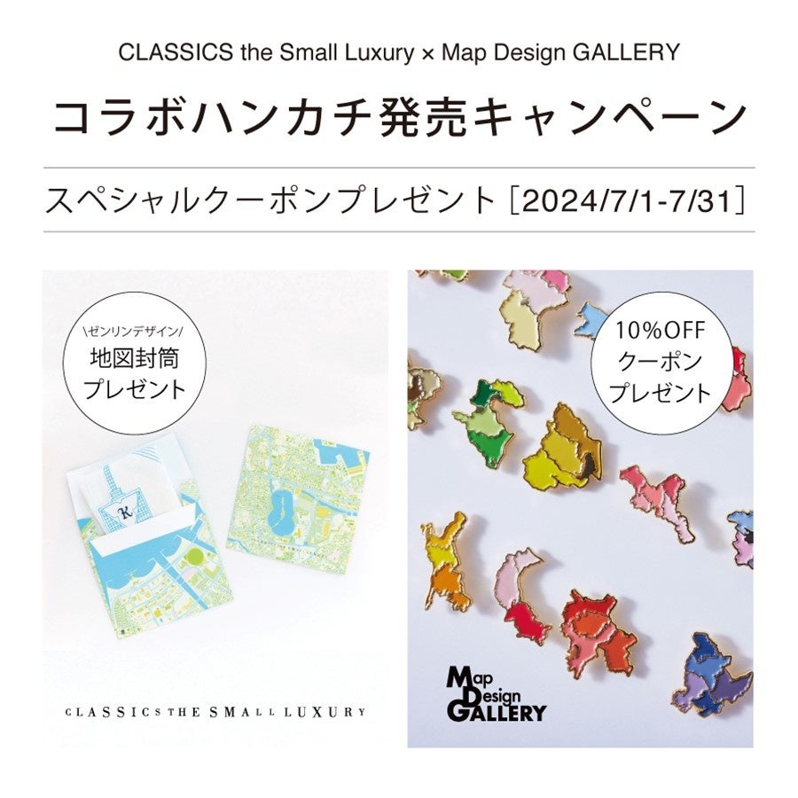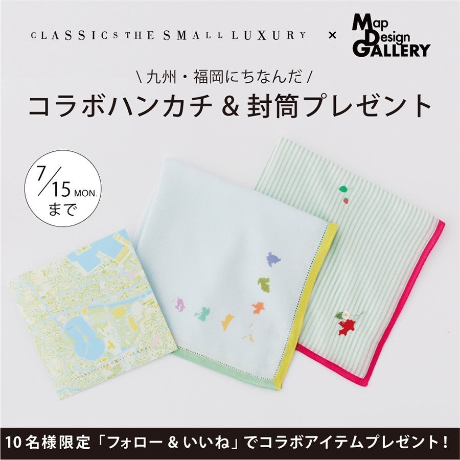 クラシクス・ザ・スモールラグジュアリ 福岡大濠公園店様よりお声がけいただき、リニューアル3周年記念として、店舗周辺のゼンリン地図データを用いた地図柄封筒(※)が発売されました。その取り組みをきっかけとし、この度、クラシクス・ザ・スモールラグジュアリとゼンリンがコラボレーションし、ハンカチを発売する運びとなりました。