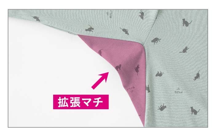 介護の現場ではパジャマを着せる際に、「拘縮により相手の腕が上がりづらく、持ち上げるのが大変」などのお悩みがありました。本商品は、拘縮や着脱時における動作の苦労を和らげるために脇下にマチパーツを取り付けました。これにより可動域が広がり、腕を少し持ち上げるだけで袖を通すことができ、介護者の方が着せやすいだけでなくご自身でも脱ぎ着がラクになります。また、部分的なマチ仕様なので腕の部分がもたつくことはありません。