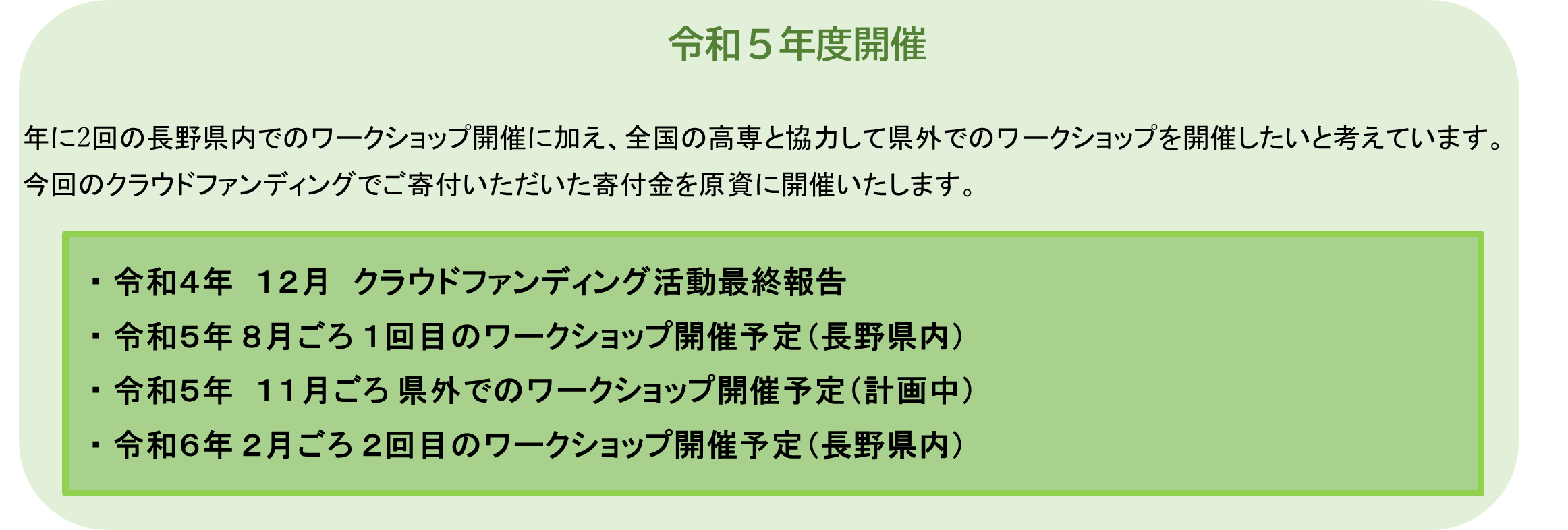 目標金額を上回った分に関しましては、本ワークショップを長野県だけでなく、全国へ広げるための活動資金とさせていただきます。国立高専は全国に51高専(55キャンパス)あり、他県の高専とのコラボ企画として本活動を全国へ広げていきたいと考えております。