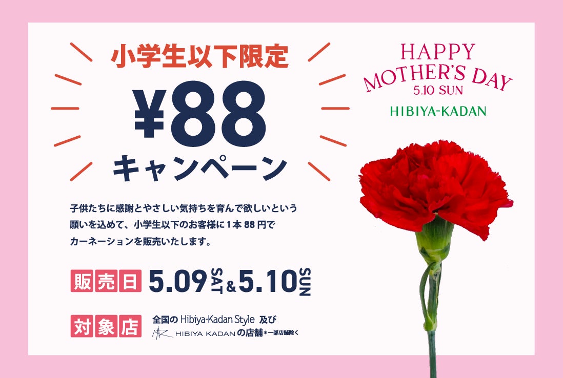 株式会社日比谷花壇(本社:東京都港区、代表取締役社長:宮島浩彰)は、5月10日(日)の「母の日」に合わせ、2026年5月9日(土)・10日(日)の2日間限定で、小学生以下のお子様を対象にカーネーション1本を特別価格「88円(税込)」で販売する「母の日88円キャンペーン」を、全国のHIBIYA KADAN、Hibiya-Kadan Style(一部除く)にて実施いたします。