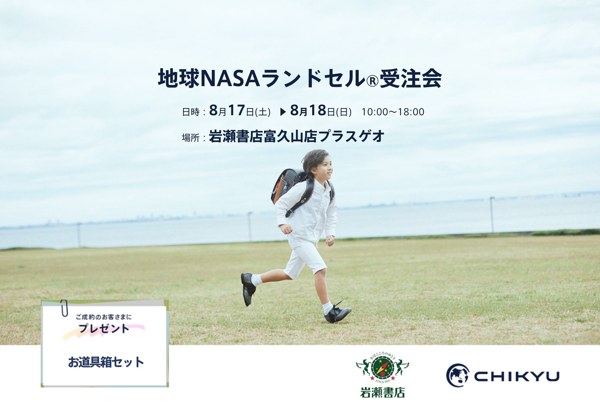 ランドセルの企画・販売を行うCHIKYU株式会社(旧池田地球株式会社、東京都港区、代表取締役:村尾光一)は、郡山市・岩瀬書店富久山店プラスゲオにて「地球NASAランドセル®受注会」を開催いたします。