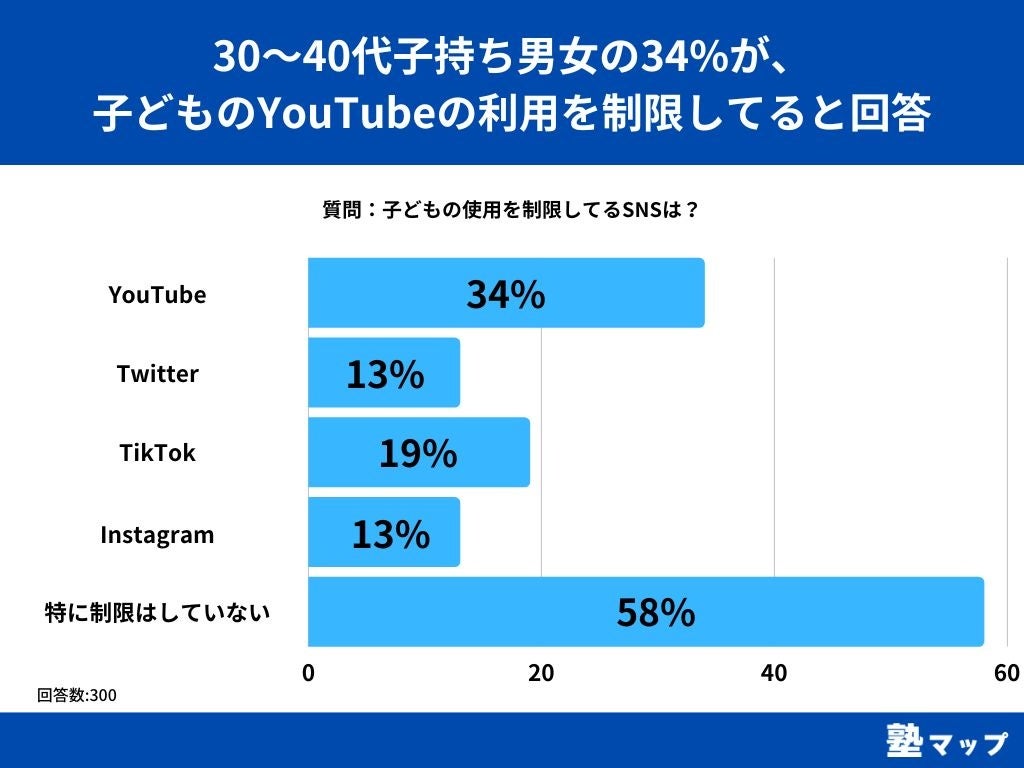 30~40代の男女を対象とした「子どもの使用を制限してるSNSは?」というアンケートで最も多かった回答は「特に制限はしていない」で58%でした。