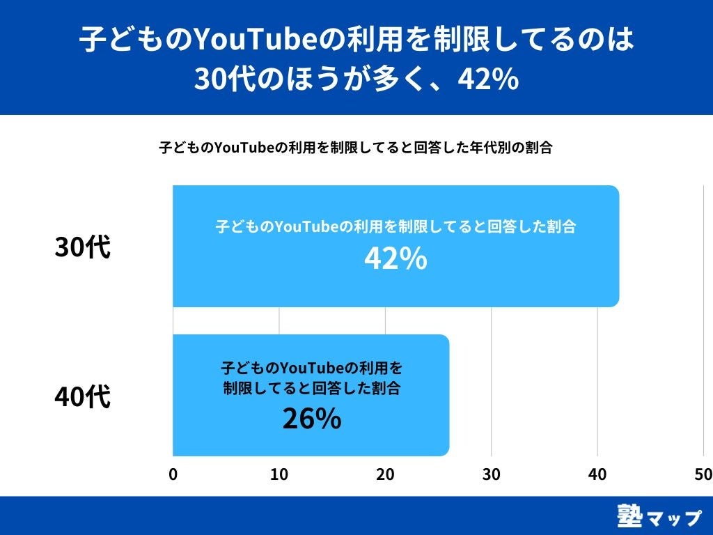 子どものYouTubeの利用を制限してると回答した割合を年代別でみてみますと、30代が42%、40代が26%という結果になりました。
