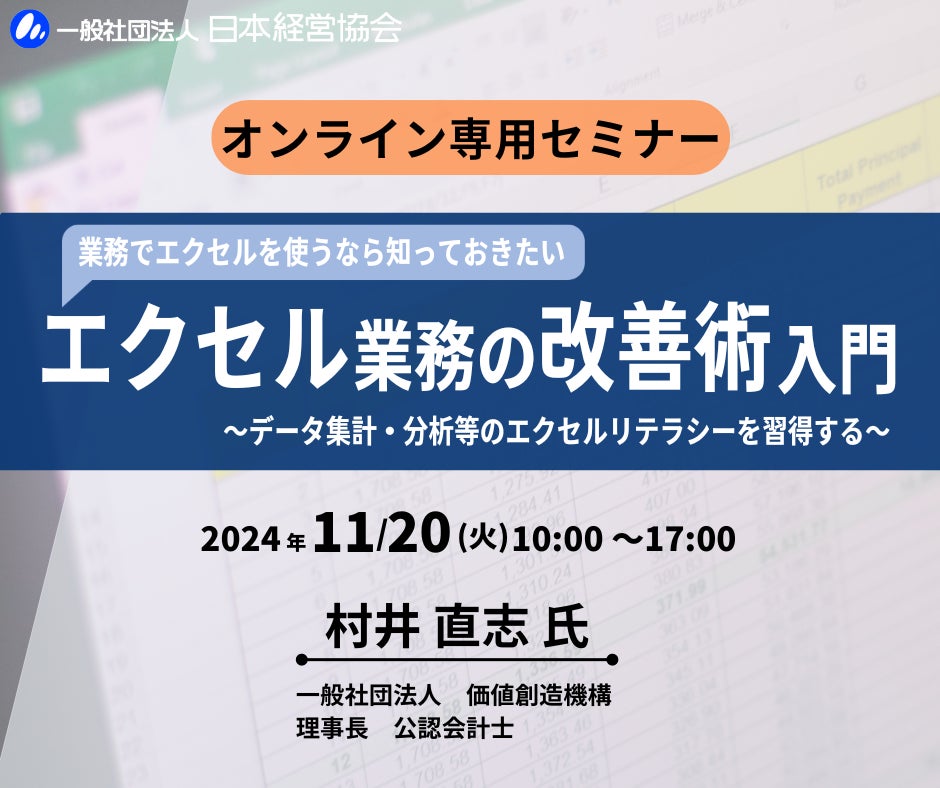 一般社団法人日本経営協会(本部事務局:東京都渋谷区、会長:高原 豪久)は、「業務でエクセルを使うなら知っておきたい エクセル業務の改善術入門」セミナーを新規開催いたします。