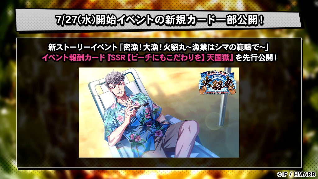 7月27日(水)から新ストーリーイベント「密漁!大漁!火貂丸~漁業はシマの範疇で~」が開催されることが決定!また、イベント報酬カードの『SSR【ビーチにもこだわりを】天国獄』も先行公開されました。