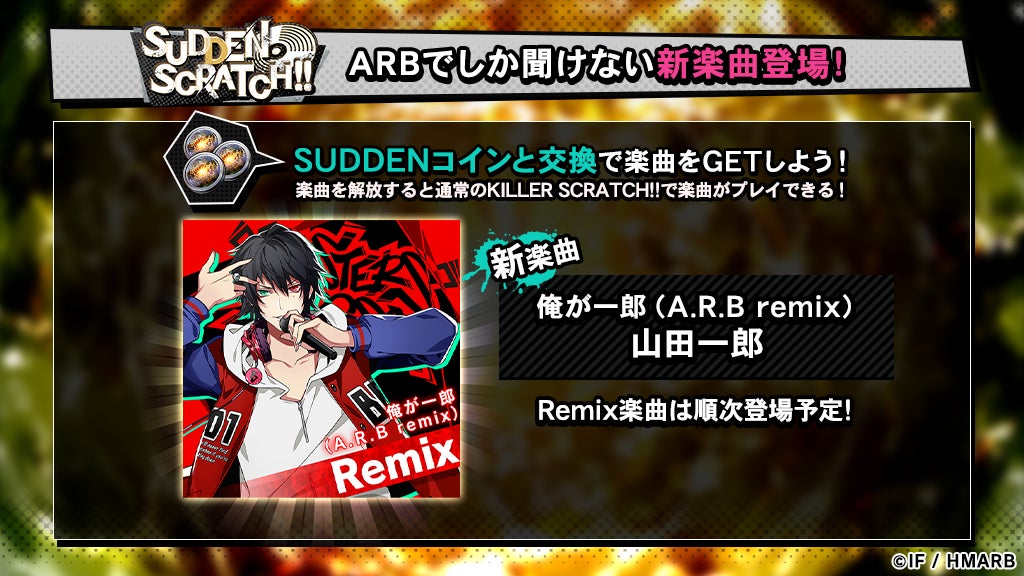 イベント期間中、KILLER SCRATCH!!をプレイするとライズ消費量に応じた確率で「SUDDEN SCRATCH!!」が発生します。SUDDEN SCRATCH!!をプレイすると、通常の報酬アイテムの他、限定アイテム「SUDDENコイン」を獲得することができます。「SUDDENコイン」を集めることで、Gコレクトチケットやオートプレイカセット、『ヒプマイ -A.R.B-』でしか聴くことができないRemix楽曲と交換することが可能です。Remix楽曲はmaeshima soshi氏が担当しております!