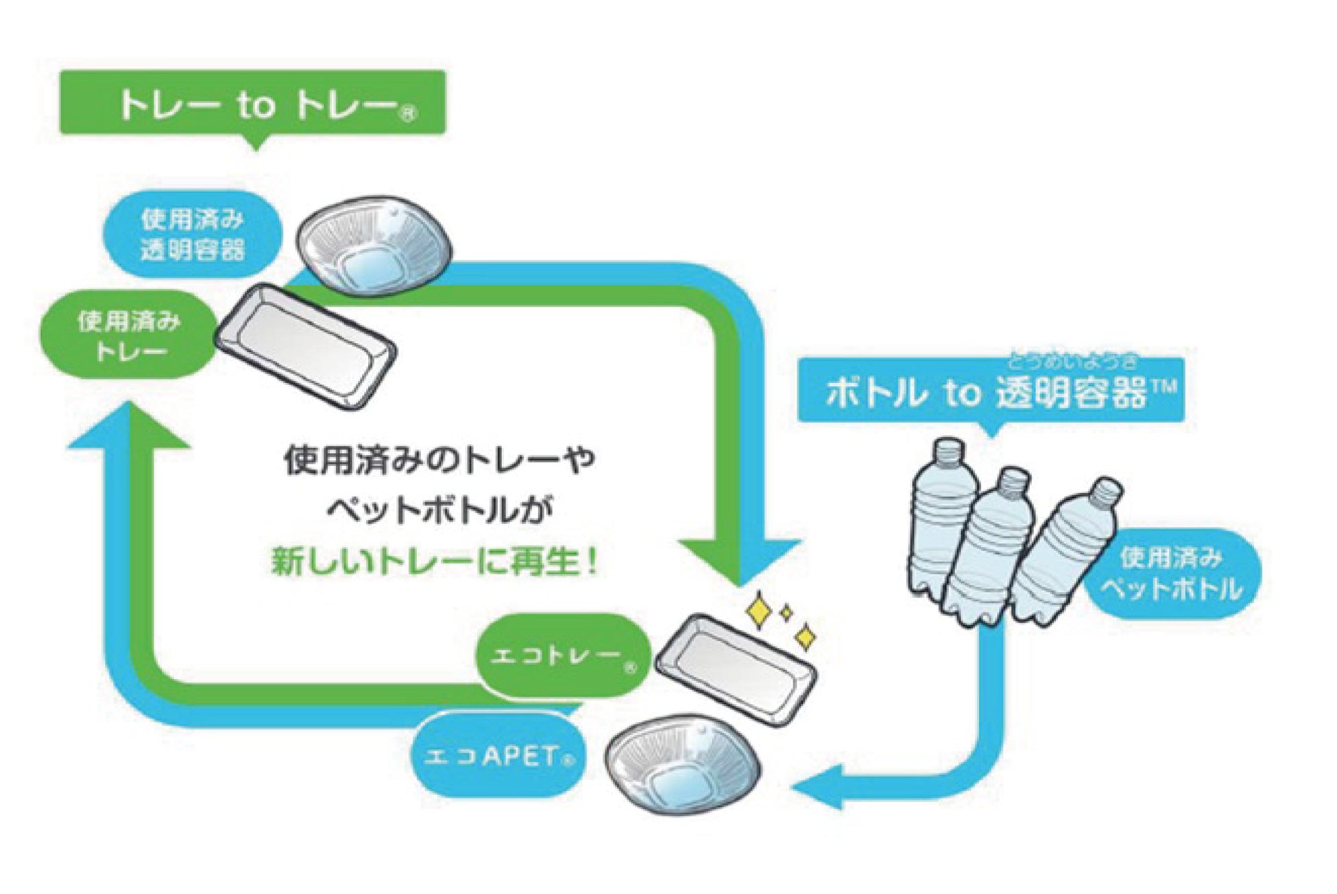エフピコはエフピコ方式のリサイクルによる地上資源の循環およびCO2排出量抑制、環境負荷の低い容器の開発による省資源化などを通じて、「持続可能な社会の実現」を目指しています。使用済み食品トレーを新たな食品トレーに生まれ変わらせる「トレーtoトレー」、及び使用済みペットボトルを回収し新たな透明容器に生まれ変わらせる「ボトルto透明容器」において、エコ製品「エコトレー」「エコAPET」を製造しています。