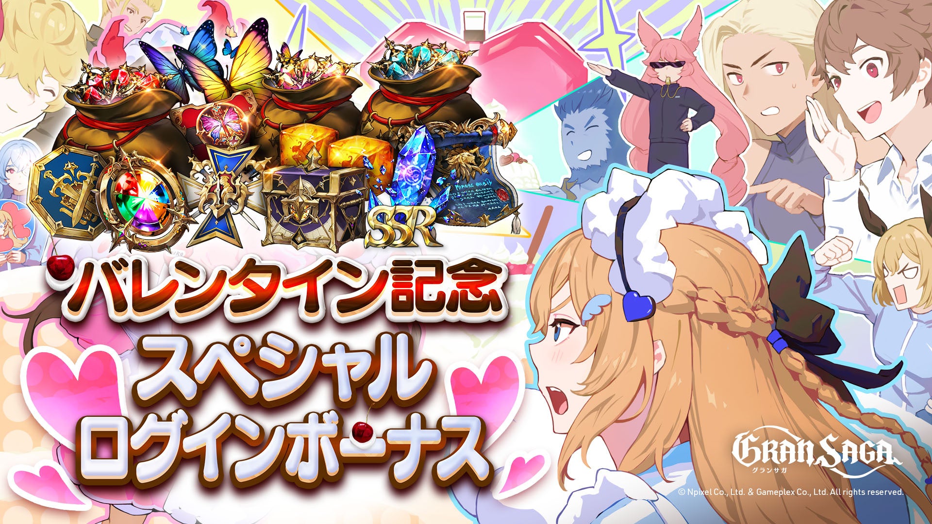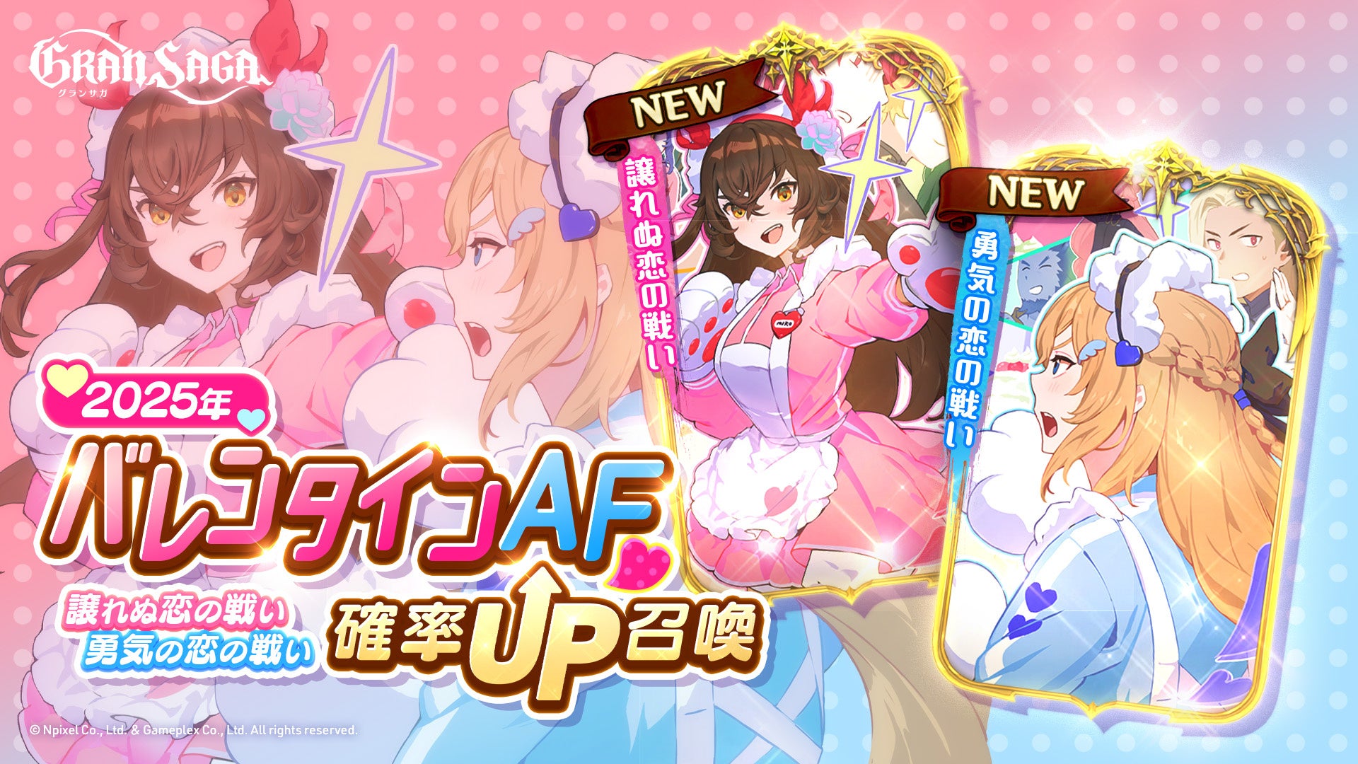 株式会社NPIXELは、本日行われたシネマティックオンラインRPG「グランサガ(Gran Saga)」(運営:株式会社GAMEPLEX)のアップデートにおいて、新たなバレンタインアーティファクト2種「譲れぬ恋の戦い」「勇気の恋の戦い」を実装しました。