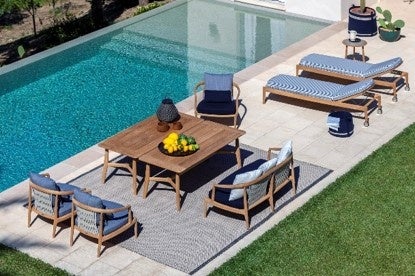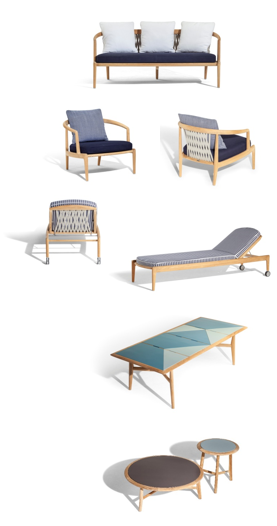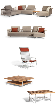 アウトドアスペースでリラックスしたいひとときにぴったりの、自然の風合いを生かしたチーク材を用いたソファとアームチェア。スリムで有機的なフォルムは卓越したクラフトマンシップが発揮されています。背面にはエクリュとトープの2色を使い、コットンバンドによる独特の編み目構造に仕上げています。屋外使用に合わせて、取り外し可能なカバー付きクッションパッドは、速乾性に優れた素材を使用している点も特長です。