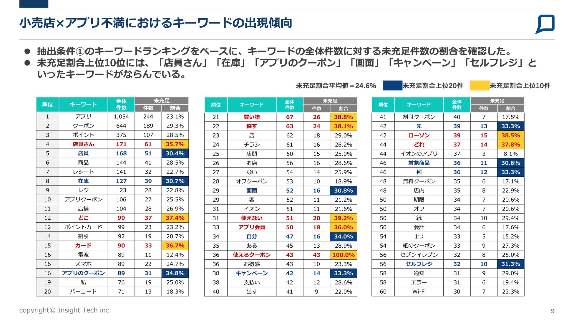 株式会社 Insight Tech(東京都新宿区、代表:伊藤友博、以下 Insight Tech)は、同社が運営する『不満買取センター』に寄せられた小売店のアプリにまつわる不満を『不満ファインダー』を用いて解析・考察したレポートを公開しました。
