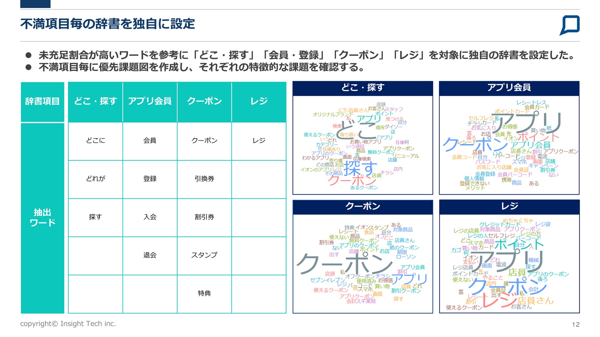 特に未充足割合の高い「どこ・探す」「会員・登録」「クーポン」「レジ」についてカスタム辞書を作成。「小売店×アプリ」不満の本文に辞書の対象ワードを含むデータセットを4つ作成した。